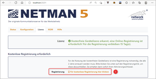 - Öffnen Sie in Ihrem Internetbrowser (zB Google Chrome) unter http://localhost:23231 die Bedienoberfläche des NETMAN und wechseln Sie in den Reiter „Lizenzen“. Dort öffnen Sie den Link zur kostenlosen Registrierung (1):