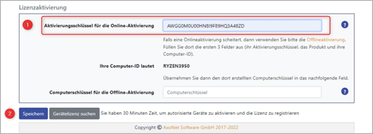 3. Kopieren Sie den Aktivierungsschlüssel in das Feld (1) und klicken Sie auf „Speichern“ (2)